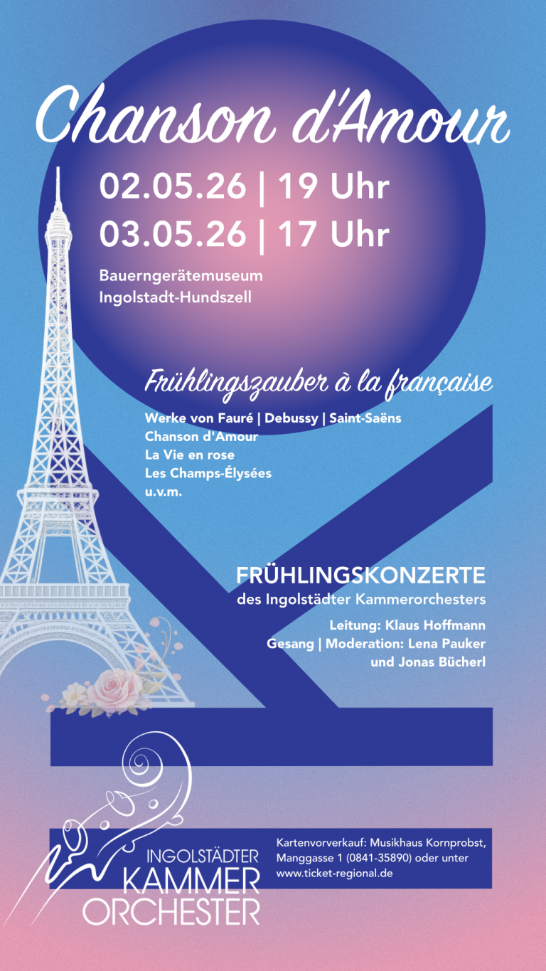 Tauchen Sie mit dem Ingolstädter Kammerorchester ein in das pralle Leben Frankreichs! Das Ensemble entführt Sie dieses Mal in unser westliches Nachbarland und präsentiert Ihnen bekannte Werke aus drei Jahrhunderten. Von „Hymne à l’amour“ aus der Feder Édit Piafs über Werke von Debussy, Saint-Saëns und Fauré bis hin zu einem Walzer von Berlioz und dem Schlager Les Champs-Élysées wird es elegant und